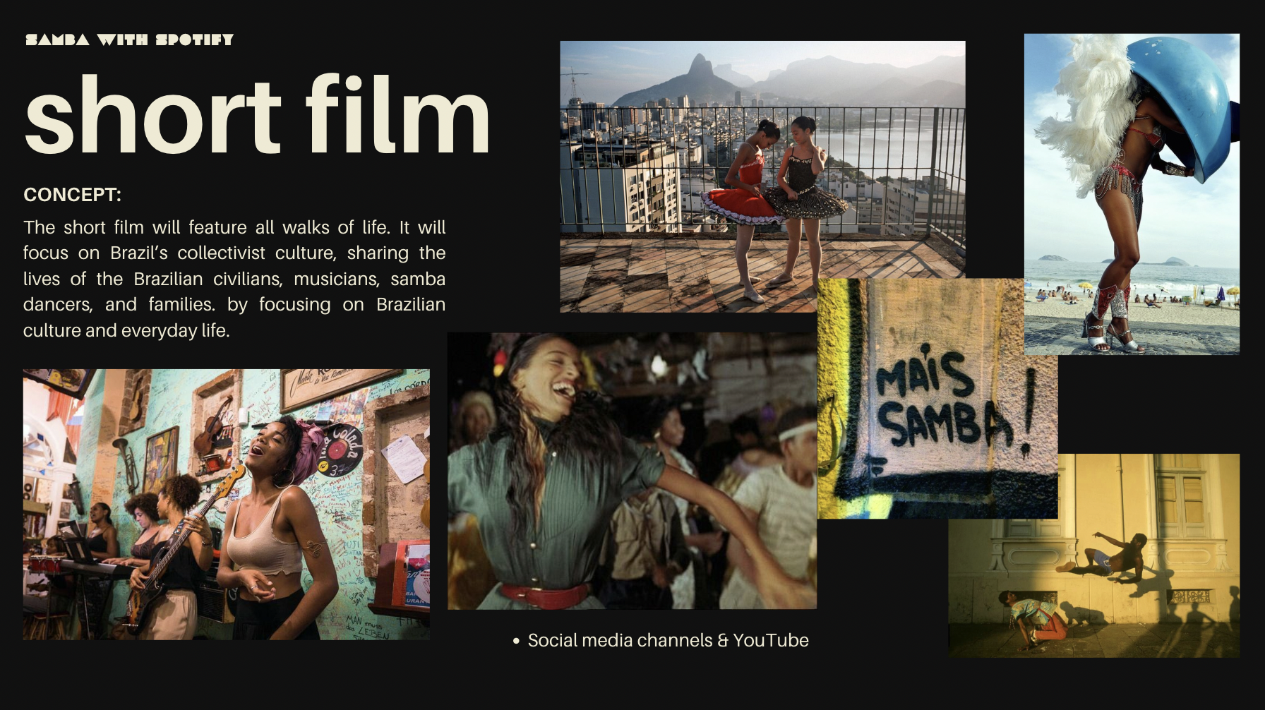 In my International Advertising course, we had a semester-long project centered around a country and large company of our choice. We chose Spotify and Brazil, and conducted a large research paper and visual presentation throughout the semester. I crafted our visual campaign, Samba with Spotify, and made a short film, social media, and print advertisements.